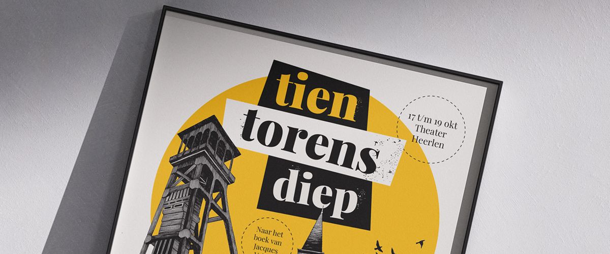 For the family show 'Tien Torens Diep' by PLT, Miosis was commissioned to develop an illustrative theatre poster that fits the historical, moving, and exciting story by Jacques Vriens about a mining colony in the 1950s.
